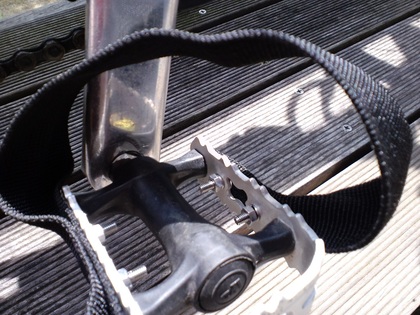 結果的には、足が小さな私には、この長さ(ペダル前後の穴の間隔=26cm)でちょうど良い感じでした(足が大きな人や幅広な人の場合には、もう少し長めをデフォルトにした方が良いと思います)。靴を斜めから差し入れて、そしてまっすぐ前に足先を向けてペダルを踏むと、足の甲がきつくもなく、かといってゆるいわけでもなく、けれど、ペダルに足が結び付けられているような具合になります。それでいて、足をペダルから離そうと思うと何の抵抗もなく靴がベルトが抜けていくのが、実に良い感じです。