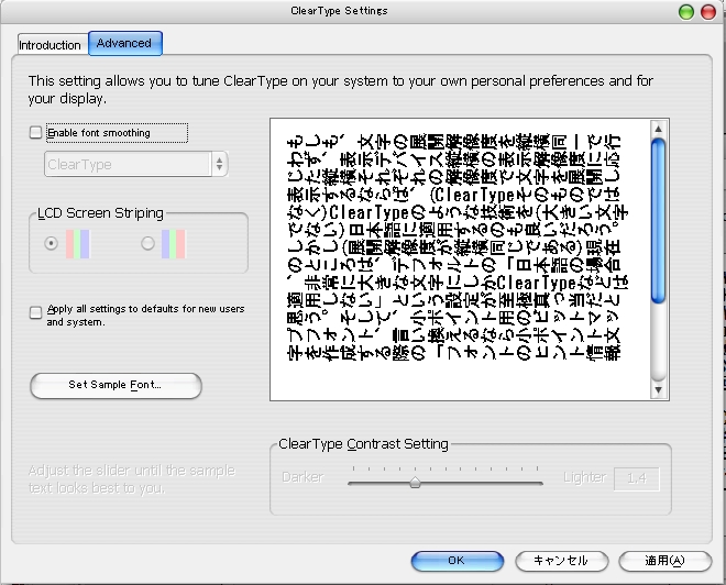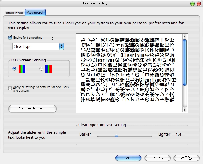 ちなみに、右の二枚の画像はClearType Tunerで、「90度回転日本語文字」に対してClearTypeの効き方を調整しているところ。左側が「ClearType無効」の場合で、右側が「ClearType有効」の場合である。使用フォントは12 pt.のHG ゴシックEだが、ふたみさんの例と同じく、ClearTypeの使用によるレンダリングの歪み・濃度の均一性(文字はもともと読みやすいものであり、濃度だって本来は偏っていないものだ)改善に非常に効果が大きいことがわかる。