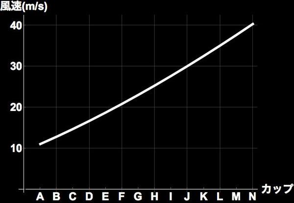 *風速の1.x乗がカップ数に比例するというオーダーは、風速が与える圧力や(アンダーバストとトップバストの差に応じて決まる)カップ数の関係を、頭に思い浮かべることができる人にとっては、とても興味深く心地良い関係なのではないかと思います。