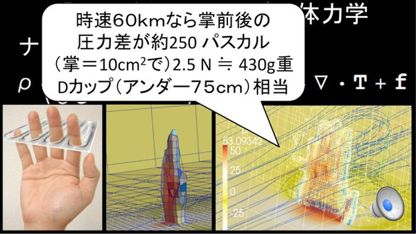 ちなみに、掌の大きさが10cm四方…つまり0.01m^2だとすると、170 Paの圧力を受ける掌は1.7 N = 0.170kg重の力を受けます。つまり、時速60kmの風を掌に受ける時、あるいは、アンダー85cmCカップのおっぱいを1.3mmほど押し縮める時、掌はウィダーゼリー(1パック180gです)を載せた時と同じ程度の力を受けるのです。…それを逆に言うならば、「ウィダーゼリーの重さ」がわからなかったら、アンダー85cmCカップのおっぱいを1.3mmほど押し縮める時の感触を思い出せば良い、というわけです。