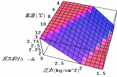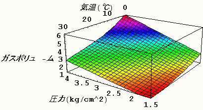 下に示した図は、温度と圧力が変化した際に、ビールの中に溶け込む炭酸ガスの量が「(溶け込む先の)ビールの体積の何倍になるか」という「ガスボリューム」を示している。この図を眺めれば判るように、低温のビールには炭酸ガスが多量に溶け込んでしまう。もちろん、炭酸ガスの圧力を高くすればさらに多くの炭酸ガスがビールの中に溶け込んでしまう。つまり、冷えたビールに高圧の炭酸ガスを注入したりすると、ビールには炭酸ガスが過剰に溶け込んでしまうのである。