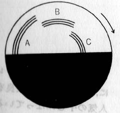 これが、「杉浦康平氏デザインのBenhamのコマ その1」を時間的に変化する動画にしてみたものだ。この図で4,5,6コマめが、先のA,B, Cに対応しているわけである。