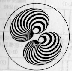 で視覚特性の資料を探した時に、この畑田豊彦氏の連載を見つけて以来、どうもはまってしまっていたのである。 特に今回面白く感じたのはBenhamのコマ(Benham's top)である。Benhamのコマというのは次のような画像を「コマ」にして回転させるというものだ。次に示すのは、「Oplus E」に掲載されていた杉浦康平氏デザインのBenhamのコマである。