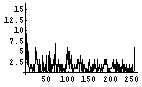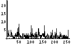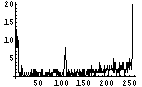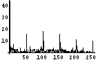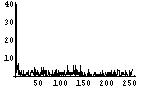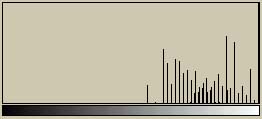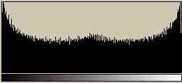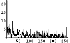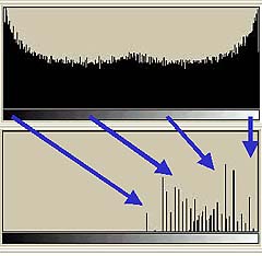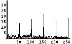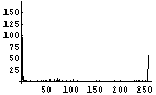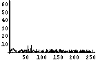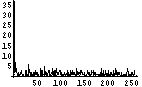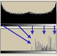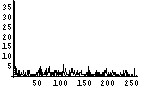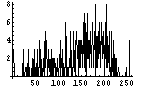 これらの2つの画像のヒストグラムを示してみよう。ばらつきが多少あるが、256階調の基準チャート(上)では256階調にわたって存在している。しかし、ASCII文字チャート(下)では(ざっと見た限りでは)35階調程度しか存在していない(これは使用するフォントによって異なる)。もともと、ASCII文字は数多くあるわけではないし、平均濃度が等しい文字も存在するので、この程度になってしまうのはしょうがない。また、最も黒い領域でも、256階調の基準チャート(上)の半分程度の濃度しかない(これも使用するフォントによって異なる)。